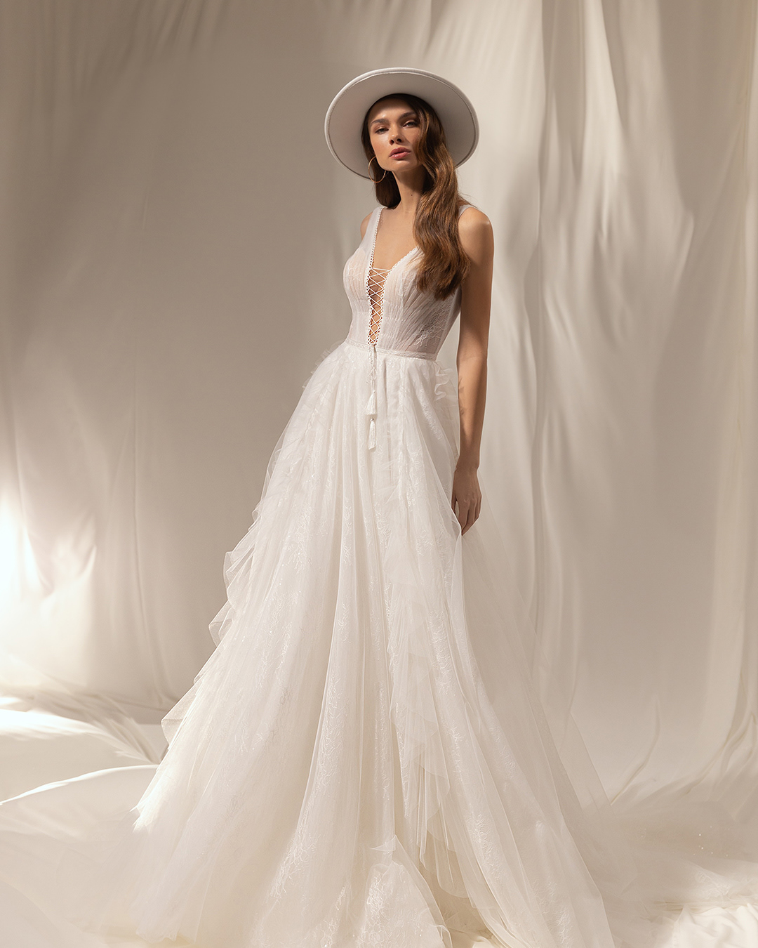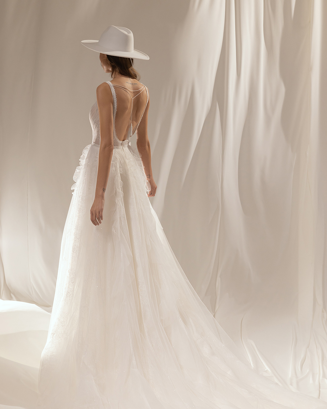 Elegante vestido boho silueta en A. Modelo ligero y vaporoso con espalda abierta, confeccionado con brillos ligeros creando un look encantador y contemporáneo.