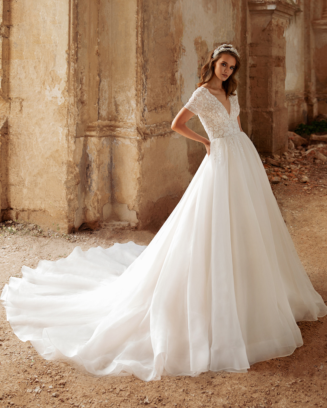 Femenino vestido silueta princesa con escote pronunciado en V. Falda voluminosa de organza que le brinda un estilo angelical. Espalda en V y aplicaciones de encaje con perlas bicolor que alcanzan la falda.