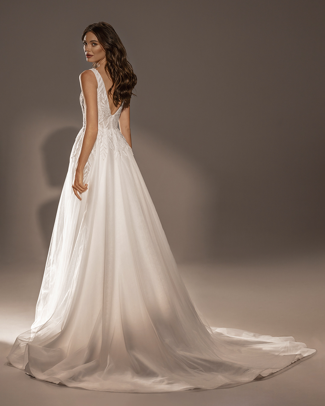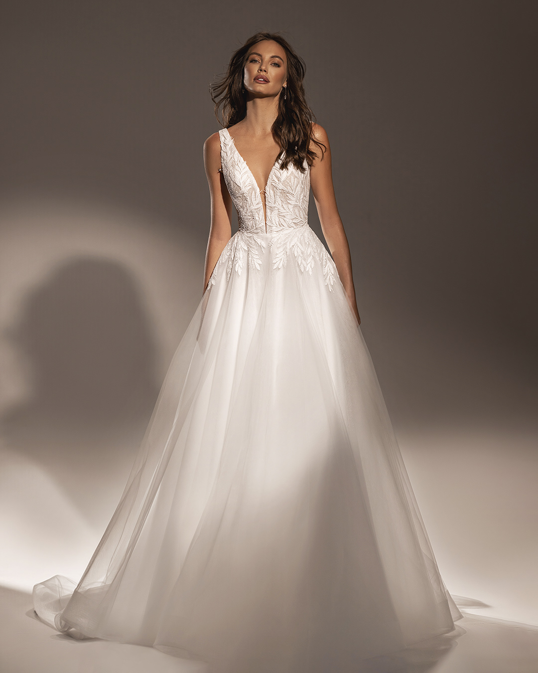 Romántico vestido estilo silueta A. El vestido tiene una falda en capas de suave tul y una parte superior de escote en V. La parte superior del vestido está confeccionada con aplicaciones de ramitas. Un estilo mu elegante y detallista.